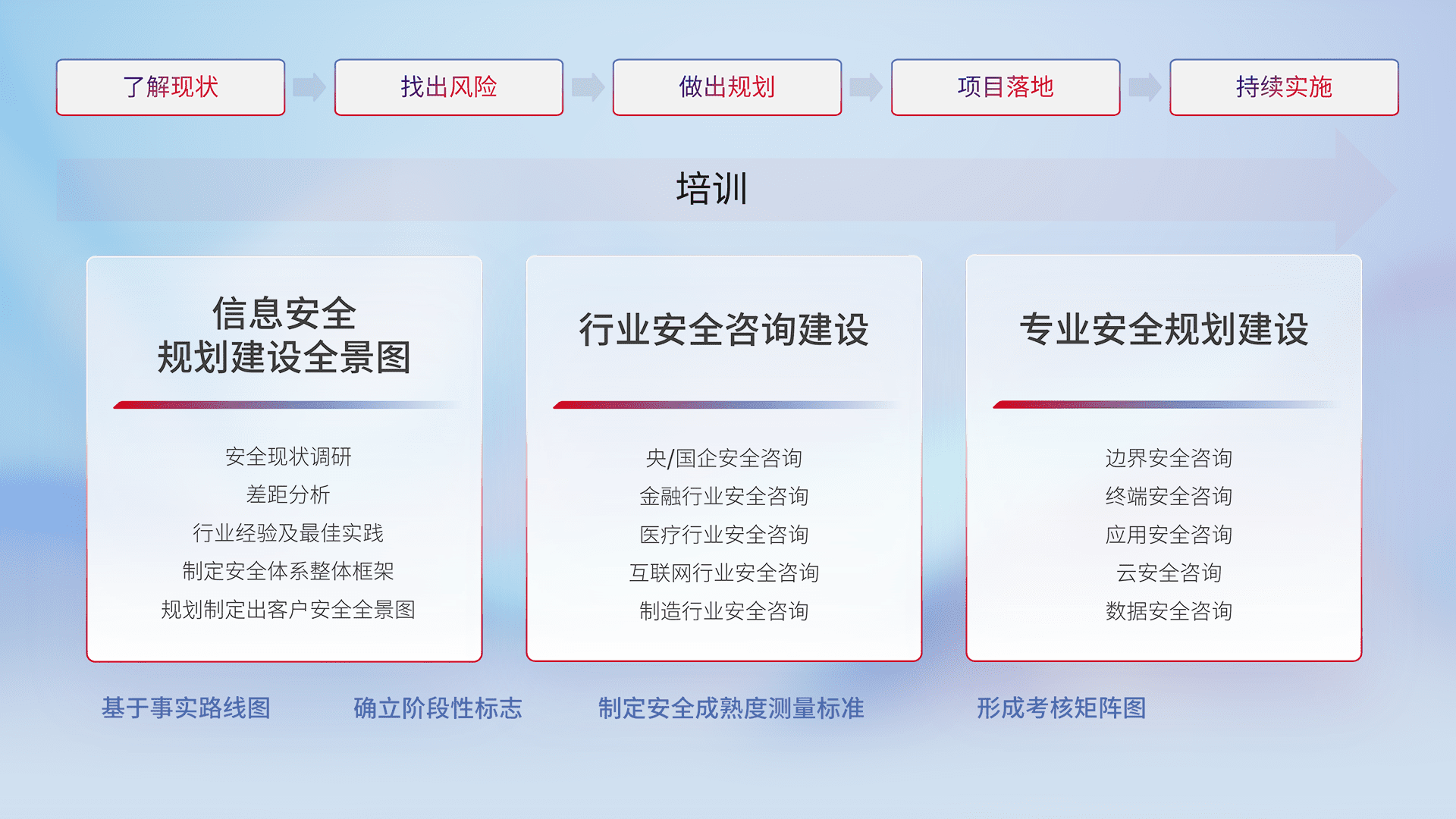 针对客户行业特性,,以专业的安全服务+多厂商联合解决方案提供专属的一站式安全管理服务,,帮助客户全面感知网络空间威胁,,,基于识别、、、检测、、分析、、、、防护、、监测、、、响应的服务理论模型,,从方案咨询、、、集成交付、、、评估验证、、、、优化加固、、运维运营,,致力于为客户提供完整的闭环管理式安全服务。。。以实战经验为客户打造高抵御风险的安全体系,,,,帮助客户发现威胁、、、对抗威胁、、处置威胁,,,,不断积累安全对抗能力,,持续保障数字化安全。。