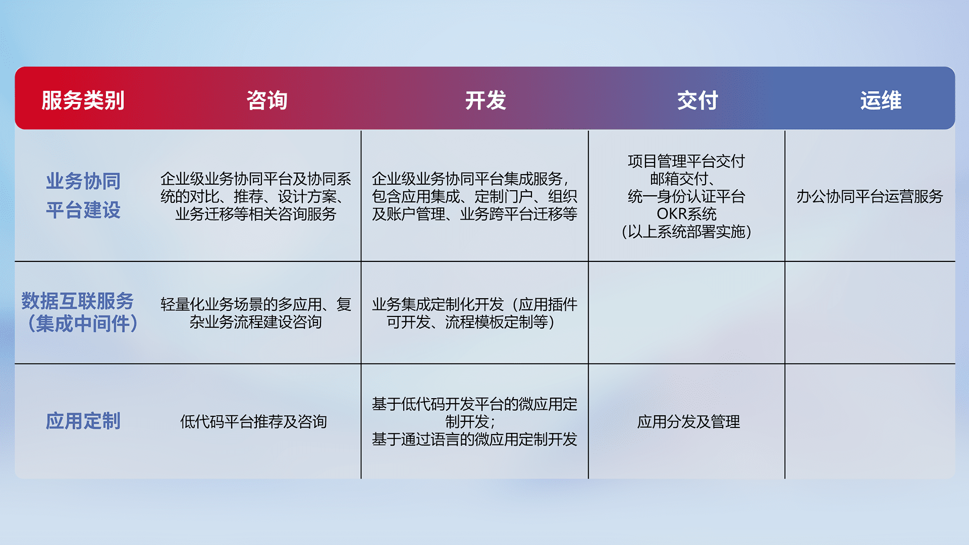 针对钉钉、、、企微、、IDaas等平台级产品提供产品的规划、、方案、、交付、、、定制化开发等服务,,,,实现如统一协同办公、、、、智能客户服务、、、、混合会议管理、、智能数据查询、、、等业务场景,,,,实现数字化转型。。。。